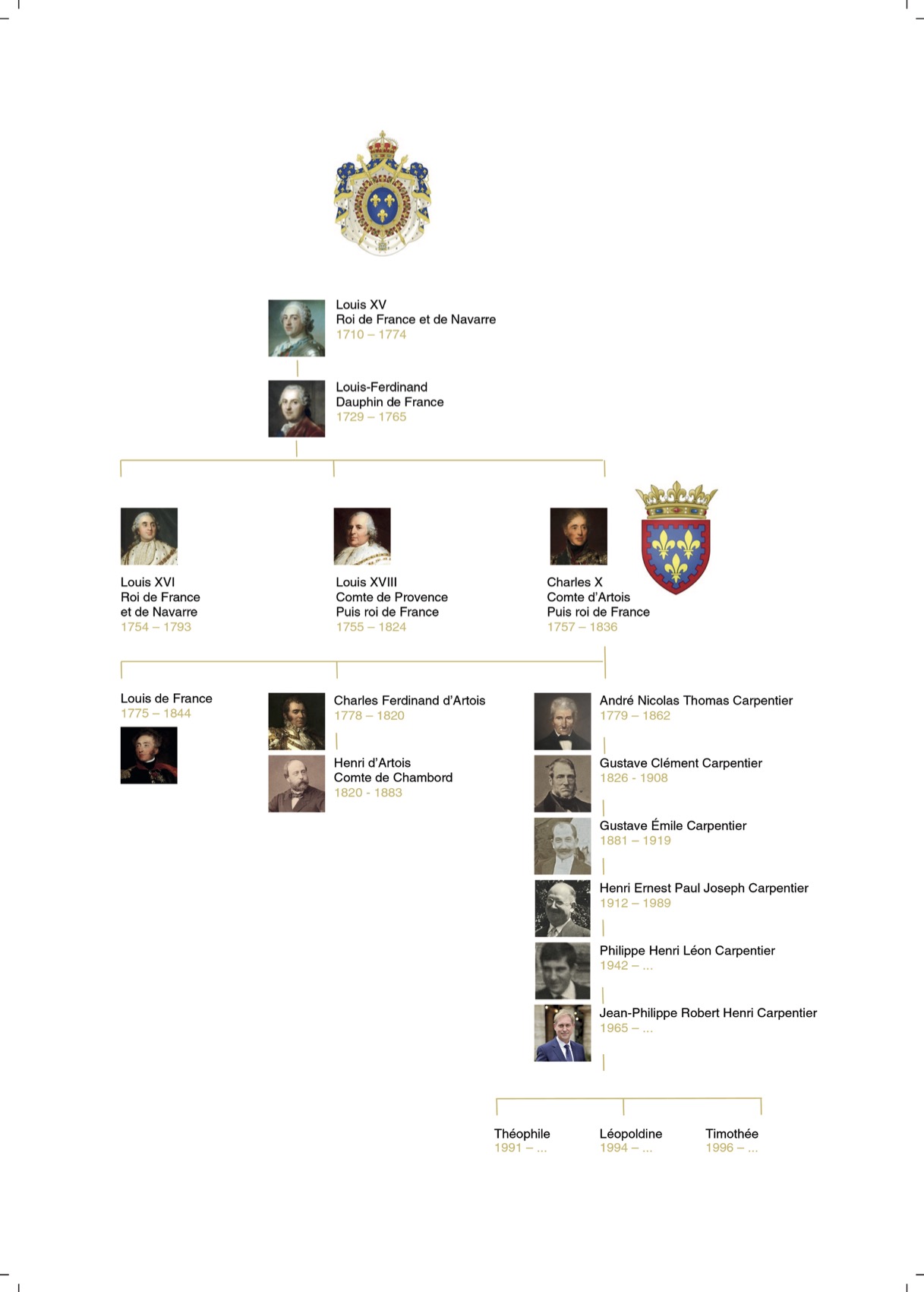 Louis XV (1710–1774), roi de France, est l'ancêtre direct de cette lignée. Ses fils, les rois Louis XVI, Louis XVIII et Charles X, forment la fratrie dont descend, en ligne strictement masculine, Jean-Philippe Carpentier. Les études ADN ont établi une concordance génétique entre Jean-Philippe Carpentier et les descendants connus de Louis XIII, confirmant ainsi son appartenance à la lignée agnatique des Bourbons.